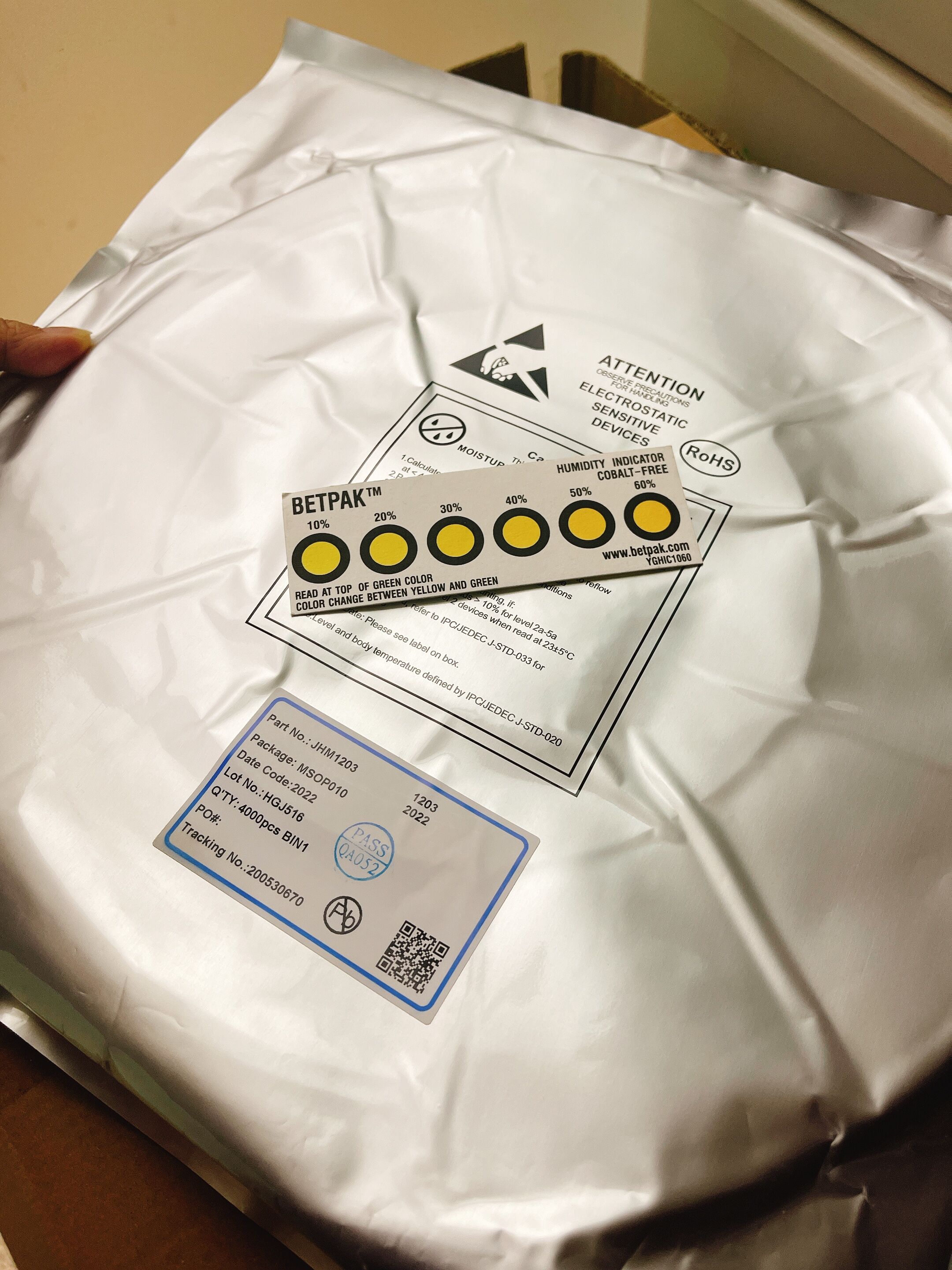 整卷芯片自帶出廠防潮封閉包裝,提供一個(gè)相對(duì)封閉、避免受潮、減少氧化的環(huán)境,為芯片的運(yùn)輸和保存提供了更良好的環(huán)境。通常整卷芯片包裝內(nèi)還有濕度卡,方便開(kāi)封時(shí)查看是否在最佳狀態(tài)下,檢查預(yù)防芯片因不適宜的存放環(huán)境而失效,造成的不良品率上升??傊?,整卷芯片購(gòu)買(mǎi)有利于保障芯片質(zhì)量,減少因運(yùn)輸、存貯環(huán)境(天氣)不合適等因素產(chǎn)生不良品的概率。